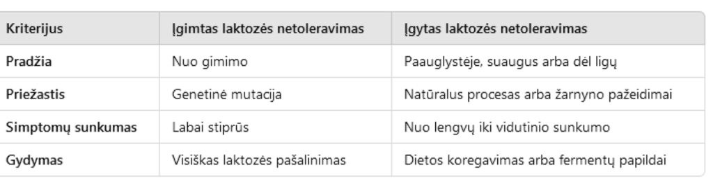 Įgytas ir įgimtas laktozės netoleravimas skiriasi savo priežastimis, pasireiškimo laiku ir valdymo galimybėmis.