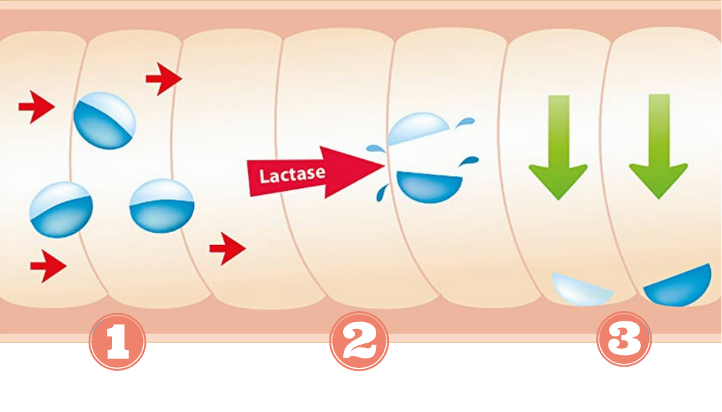 1. Laktozė (pieno cukrus) patenka į plonąją žarną.
