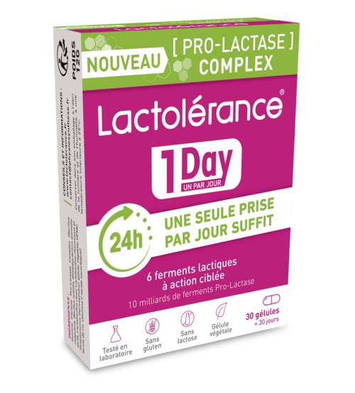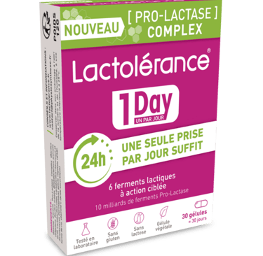 Lactolérance 1Day yra unikalus 6 specialiai atrinktų probiotikų, gerųjų pieno rūgščių, gaminančių laktazę, derinys. Laktazė pagerina laktozės virškinimą žmonėms, kuriems jos ypač reikia.